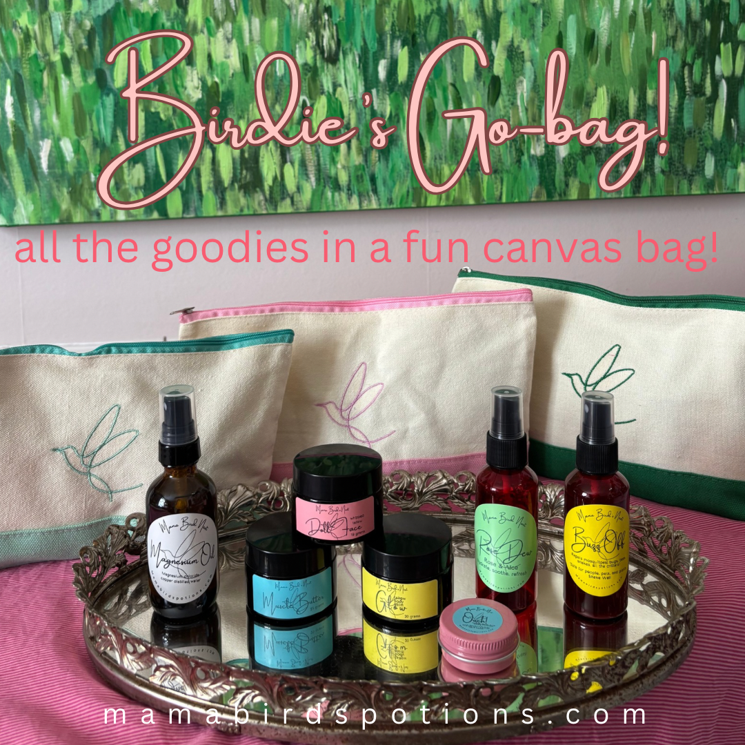 bag includes; 2 oz Magnesium Oil ( apx 3 mos), small Muscle Butter, Glow (body tallow w/ sunscreen), Doll Face, Rose Dew, Buzz Off, & Ouch!