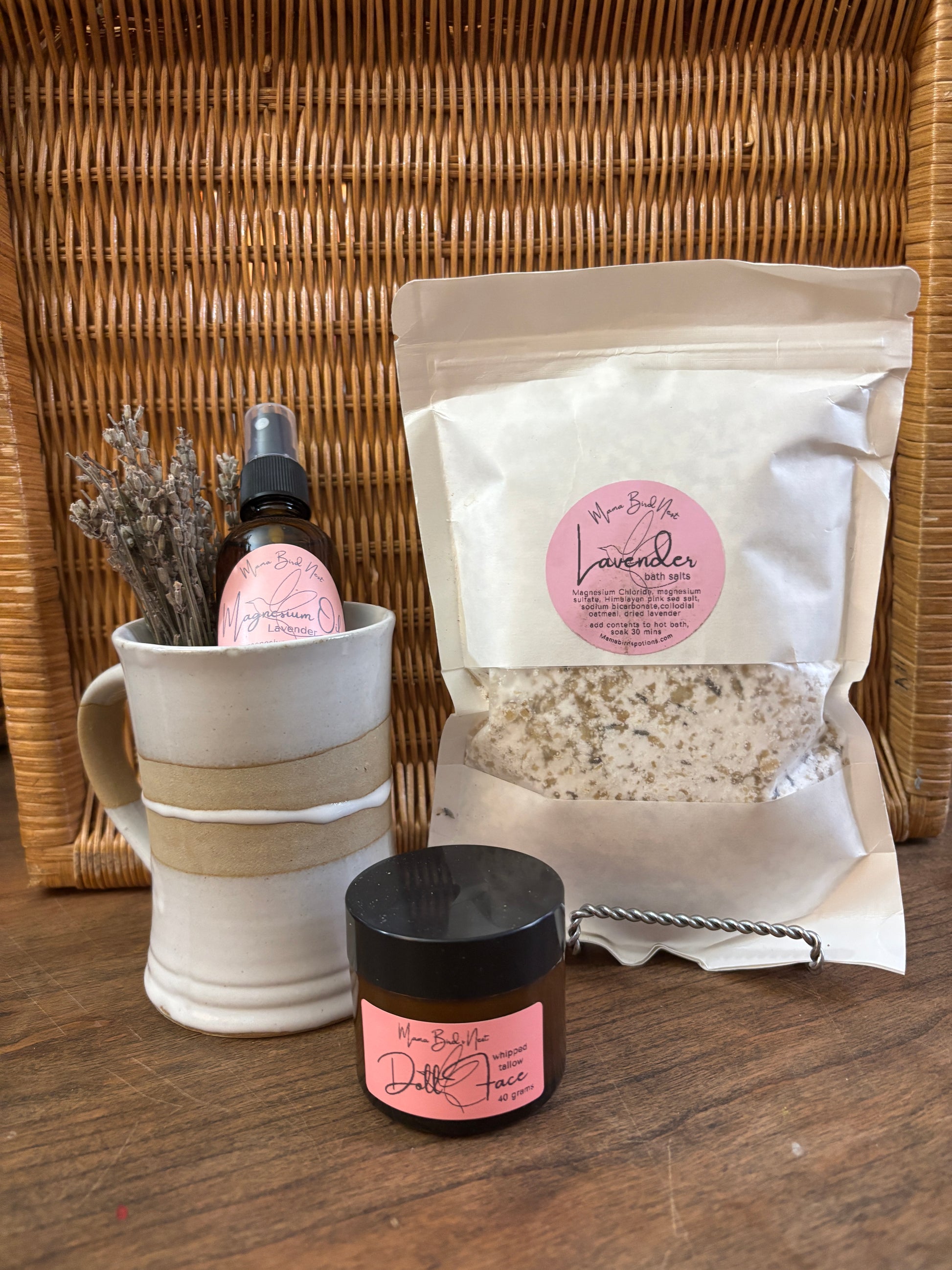 Beautiful Pottery mug, Magnesium Oil, Doll Face, and Lavender Bath Salts